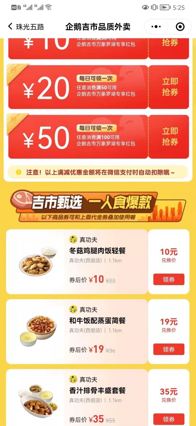 企鵝吉市是騰訊智慧零售旗下的外賣優(yōu)惠小程序,通過本次活動(dòng)攜手羅湖工信局,聯(lián)合海底撈、真功夫、gaga、太興、敏華、新發(fā)燒臘、文和友、面包新語、85°C、云海肴10家餐飲大牌派發(fā)外賣福利。
