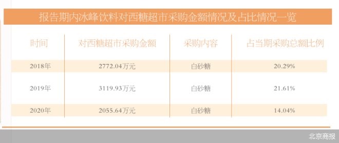 具體來看,2018-2020年期間,冰峰飲料向西糖超市采購的產(chǎn)品均為白砂糖,各期對(duì)應(yīng)的采購金額分別約2772.04萬元、3119.93萬元、2055.64萬元,占當(dāng)期冰峰飲料向前五大供應(yīng)商采購金額的比例約20.29%、21.61%、14.04%。報(bào)告期內(nèi)冰峰飲料向西糖超市采購的白砂糖占同類交易的比例分別為84.61%、91.18%和77.2%。