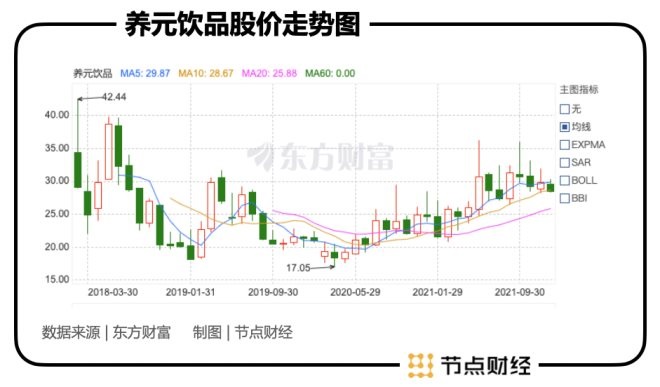 資本市場的表現(xiàn)同樣不甚樂觀。自2018年初在上交所主板上市起,養(yǎng)元飲品就開啟了“跌跌跌”模式,如今股價僅為29.26元/股,較78.73元/股的發(fā)行價已縮水大半,距離113.37元/股的歷史高點更是相距甚遠(yuǎn)。