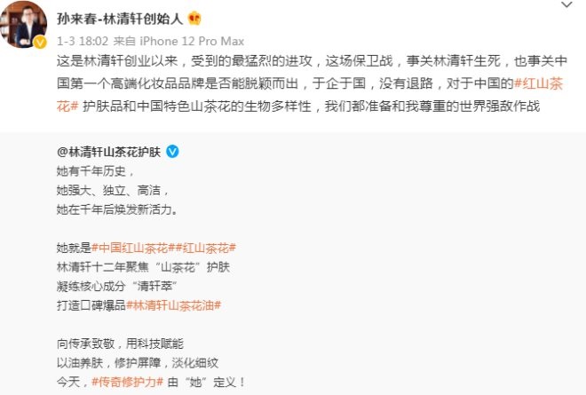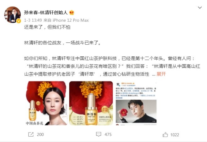 1月3日,林清軒創(chuàng)始人孫來春發(fā)文稱,香奈兒近日在社交媒體宣布將發(fā)布“紅山茶花護膚”系列,是“早有預(yù)謀”,并表示林清軒正受到創(chuàng)業(yè)以來最猛烈的進攻,事關(guān)品牌生死。