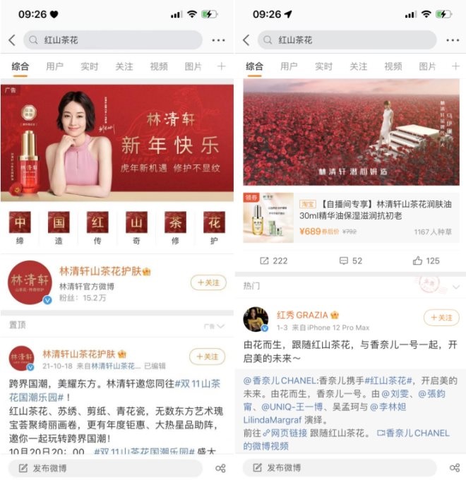 今日,青眼在微博上以“紅山茶花”為關(guān)鍵詞搜索,顯示出的是林清軒投放的廣告。但在林清軒的置頂微博下,第一條微博便是香奈兒紅山茶花的熱門微博,主微博轉(zhuǎn)發(fā)量已突破100萬+,兩廂競爭之勢凸顯。