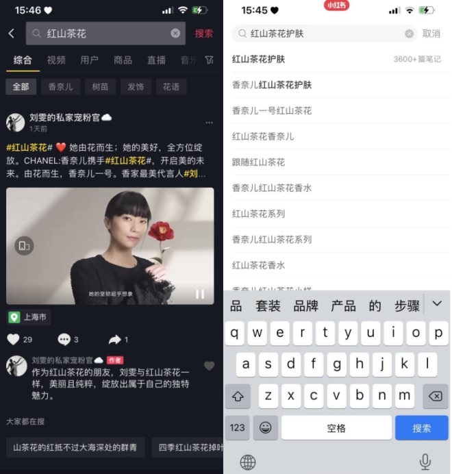 此外,青眼發(fā)現(xiàn)在小紅書、抖音等平臺,香奈兒同樣做了推流和種草,已有無數(shù)KOL、KOC、品牌代言人粉絲進行了相關(guān)推廣,而在小紅書上“紅山茶花護膚”筆記也已與香奈兒深度關(guān)聯(lián)。