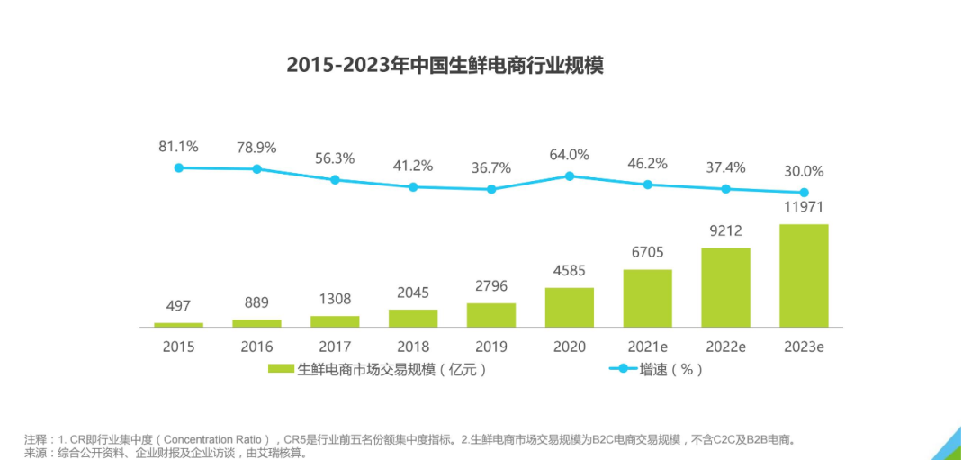 據(jù)艾瑞咨詢預(yù)測,2023年生鮮電商規(guī)模將超萬億。但是,不斷下滑的增長曲線也讓人難以保持樂觀。對每日優(yōu)鮮和叮咚買菜來說,活下去是迫在眉睫的問題。技術(shù)的提升也好,模式的優(yōu)化也好,總要找到一條盈利的路。