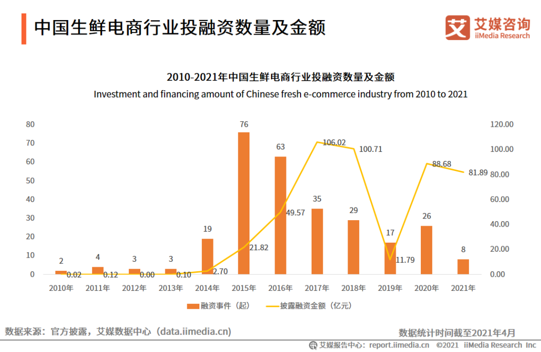 據(jù)艾瑞咨詢統(tǒng)計,國內(nèi)生鮮行業(yè)第一波投融資高潮是在2015年,融資事件高達(dá)76起。在2016-2018年,融資金額逐年攀升,在2017、2018年均突破100億元。雖然2019年進(jìn)入平淡期,但是在2020年疫情后,生鮮電商再度成為風(fēng)口,全年總?cè)谫Y額88.68億元。