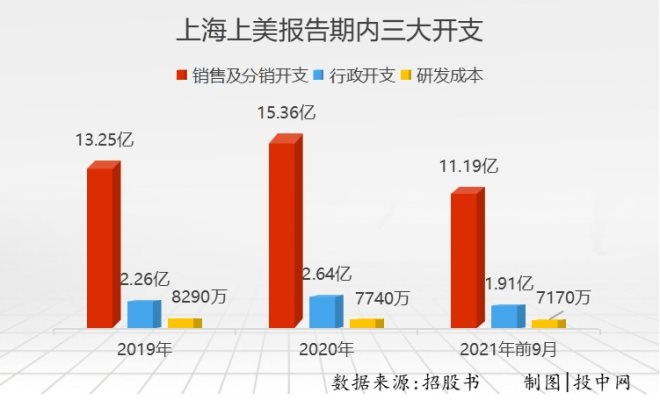 上美的營銷費(fèi)用不菲。2019年、2020年及2021年前三季度,銷售及分銷開支分別為13.25億元、15.36億元及11.19億元,分別占公司總營收的46.1%、45.4%和43.1%。