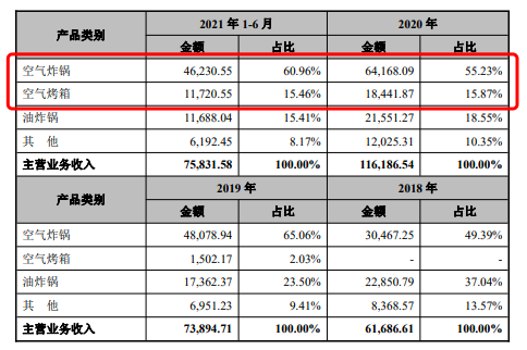 比依股份專注于空氣炸鍋、空氣烤箱、油炸鍋等加熱類廚房小家電產(chǎn)品設(shè)計、制造和生產(chǎn)。2021年上半年,比依股份空氣炸鍋的銷售占比達60%,這也意味著若能順利登陸A股市場,比依股份將會成為名副其實的“空氣炸鍋第一股”。