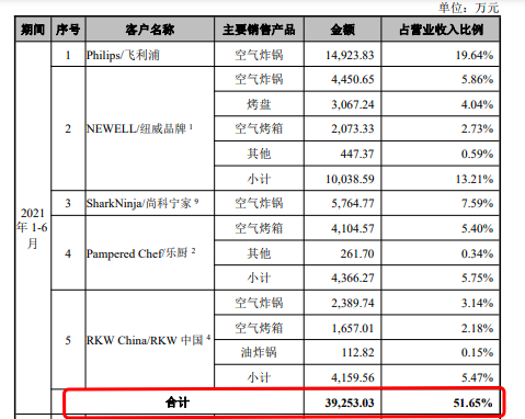 招股書顯示報告期內(nèi),公司核心產(chǎn)品空氣炸鍋的銷售占主營業(yè)務(wù)收入的比例分別為 49.39%、65.06%、55.23%和 60.96%,在成為公司收入及利潤主要增長點的同時,也凸顯了公司核心產(chǎn)品種類較為有限的問題。