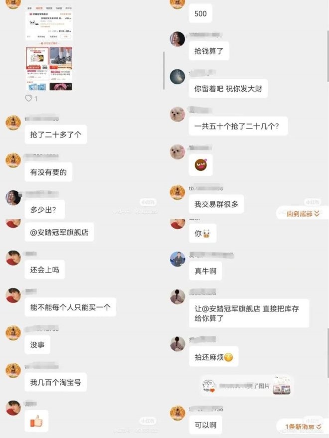 甚至在淘寶安踏官方旗艦店的粉絲群里,都有黃牛直接整點(diǎn)搶二十多個(gè),在群里高價(jià)出售。