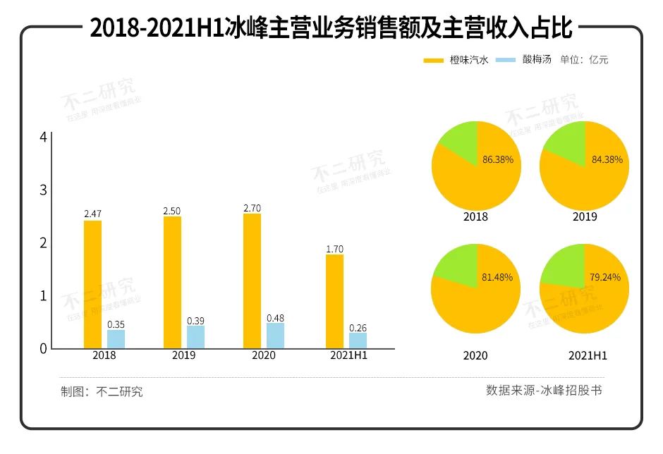 從冰峰主營業(yè)務(wù)收入產(chǎn)品構(gòu)成情況來看,2018-2020年,以及2021上半年,冰峰橙味汽水(含玻璃瓶與罐裝)的銷售額分別為2.47億、2.5億、2.7億和1.7億,占其主營收入的比例分別為86.38%、84.38%、81.48%和79.24%,穩(wěn)定在80%左右。