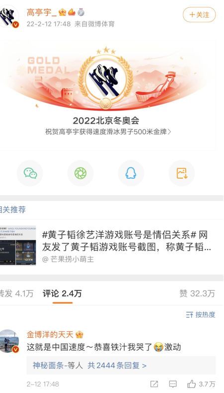在高亭宇拿下速度滑冰男子500米金牌后,微博就在高亭宇自動發(fā)布了相關微博,花滑選手金博洋評論道“這就是中國速度~恭喜鐵汁我哭了,激動”。