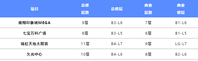 體量最小的七寶萬(wàn)科廣場(chǎng)共有6層商業(yè)面積(地下1層、地上5層),其余項(xiàng)目商業(yè)樓層數(shù)均超過(guò)7層,地上層數(shù)也都超過(guò)6層。