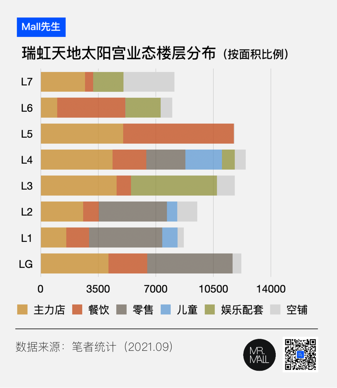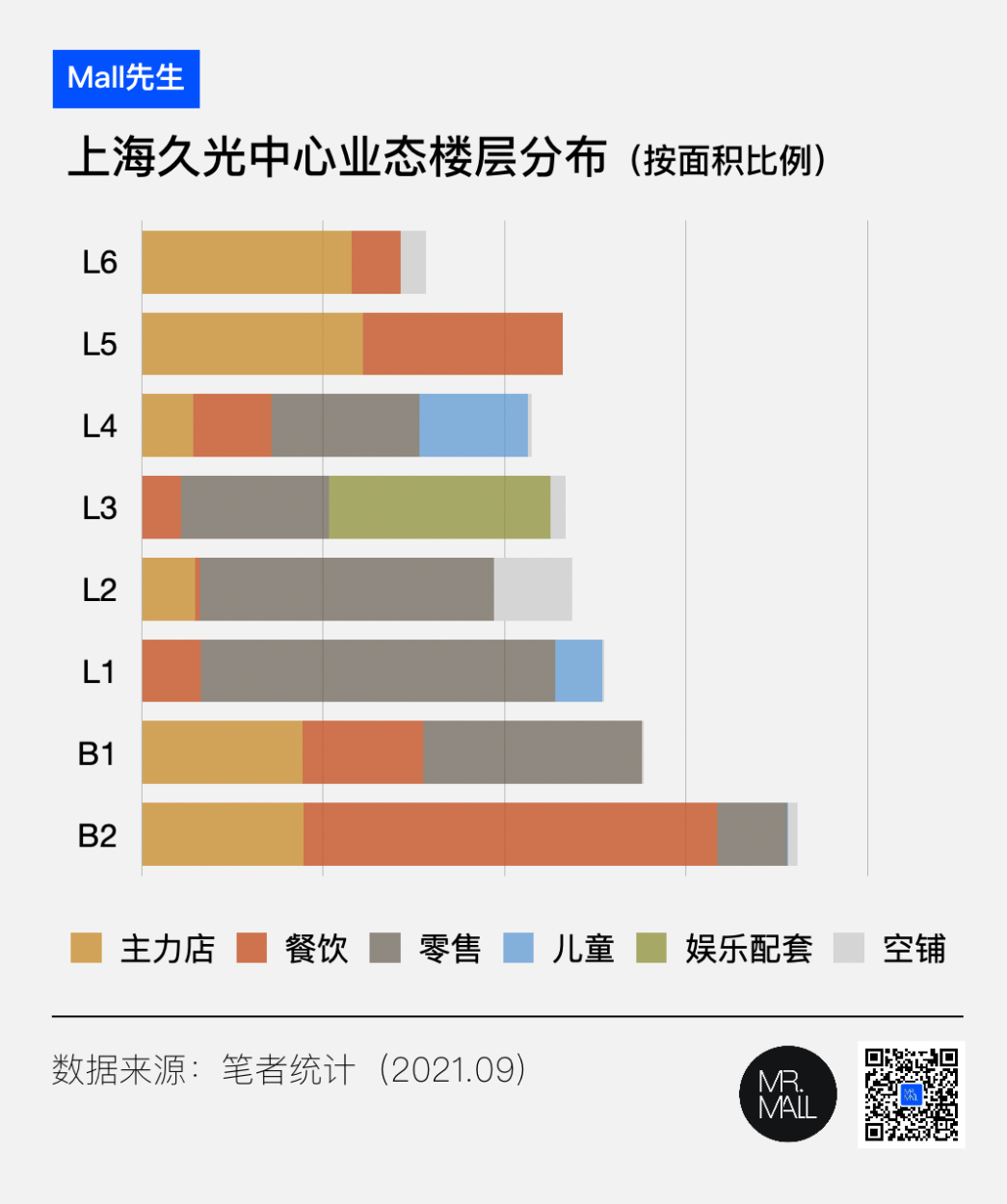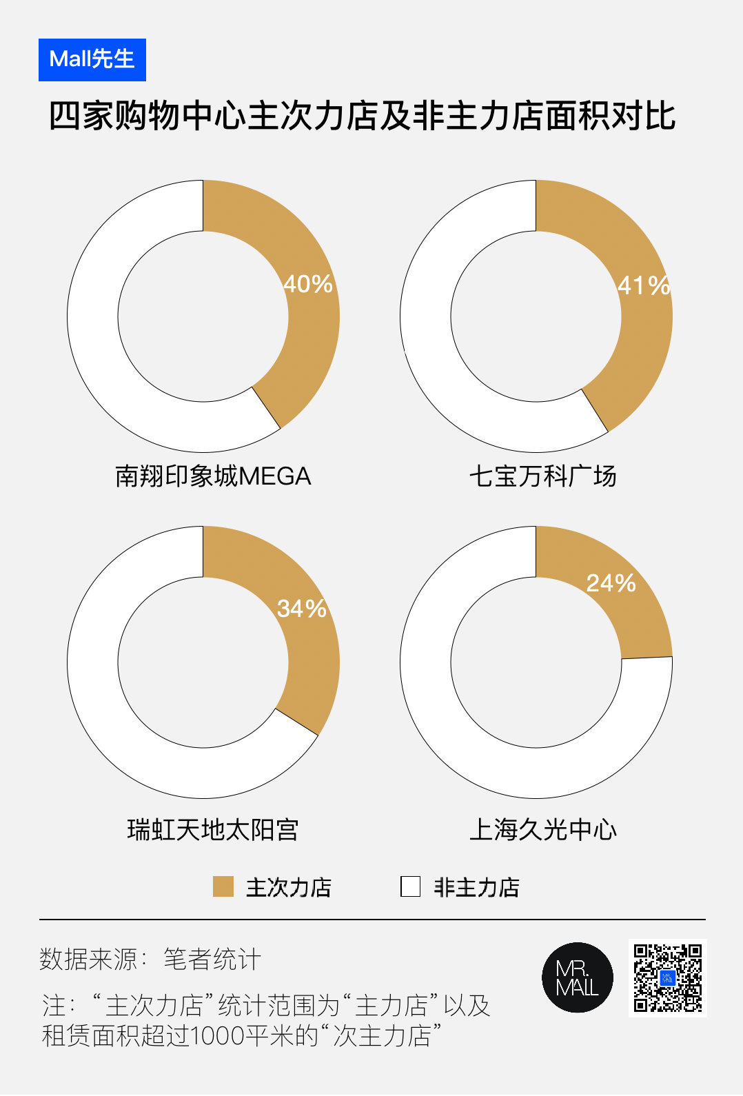 而本文調(diào)研的4個(gè)項(xiàng)目,即使是單層面積較小,因而超大型主力店較少的瑞虹天地太陽(yáng)宮,其主次力店面積占比也超過(guò)了1/3。