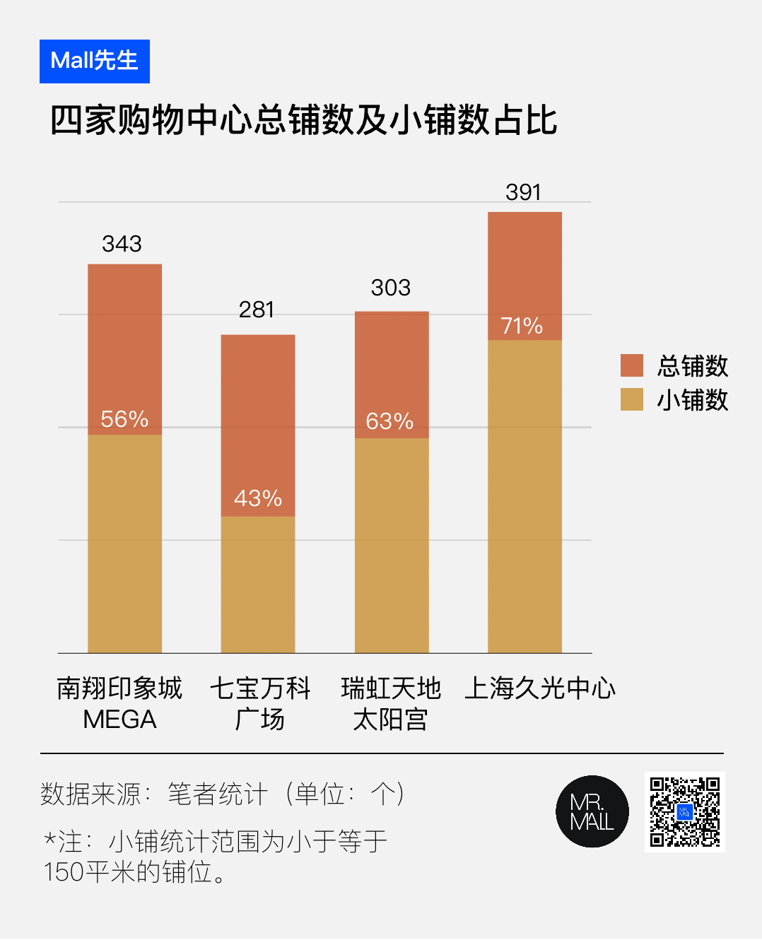 其中久光中心因?yàn)橛邪儇洏I(yè)態(tài),小鋪數(shù)量最多,達(dá)到了驚人的70%。