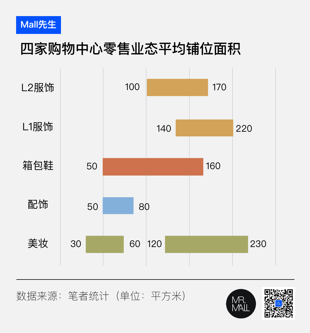 箱包鞋的面積接近或略小于服飾店鋪;配飾主要是面積區(qū)間在50-80平米的小鋪;美妝會(huì)如上文所述,根據(jù)級(jí)次不同,分為30-60平米的地下小鋪和120-230的首層大鋪。