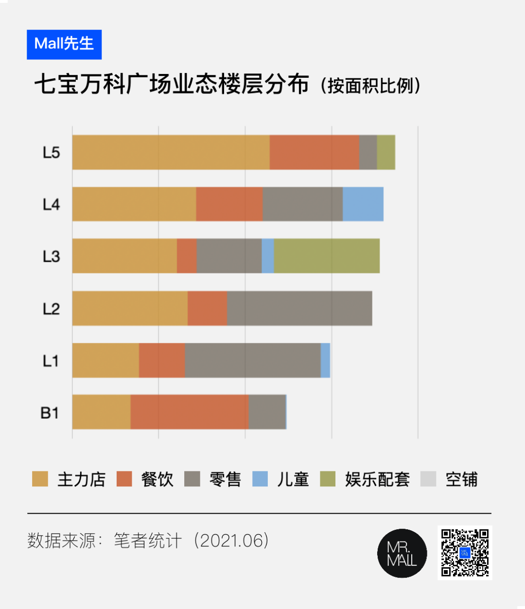 我們根據(jù)現(xiàn)場(chǎng)統(tǒng)計(jì)與平面圖對(duì)照,按照面積比例對(duì)上述項(xiàng)目的業(yè)態(tài)樓層分布進(jìn)行了統(tǒng)計(jì)和繪制,如下圖所示: