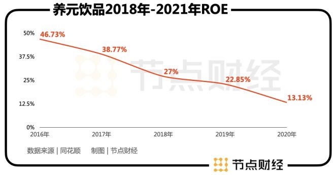 總體比較來看,養(yǎng)元飲品目前的估值相對處于行業(yè)中下水平。而從ROE(凈資產收益率)表現(xiàn)來看,2016年至2020年,其數(shù)值從46.73%逐年下滑至13.13%。相比之下,承德露露同期雖然從未達到過30%以上,但一直保持在20%以上,表現(xiàn)更為穩(wěn)健。