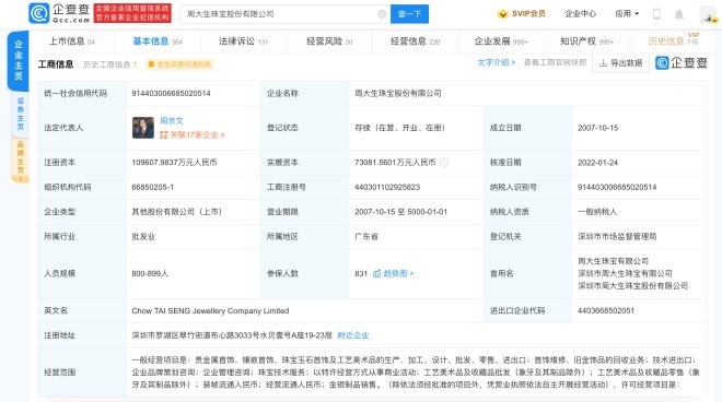 企查查APP顯示,周大生珠寶股份有限公司成立于2007年,法定代表人為周宗文,注冊(cè)資本為10.96億元人民幣,于2017年在深交所主板上市。