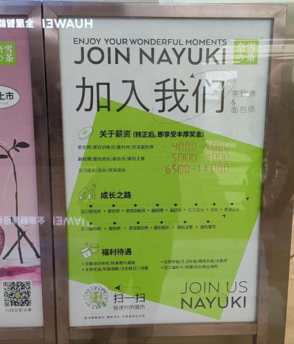 港股研究社發(fā)現(xiàn),奈雪標(biāo)準(zhǔn)店后廚大部分空間留給了體型龐大的烘焙設(shè)施。此外,根據(jù)實(shí)時(shí)招聘公告,奈雪的茶烘焙產(chǎn)品員工基礎(chǔ)待遇也要高于茶飲員工。