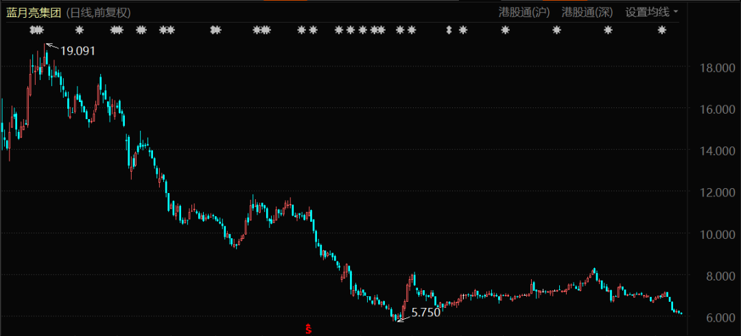 2021年1月沖高達(dá)到98.46倍后,如今藍(lán)月亮回歸到38倍市盈率,而價(jià)值回歸的過(guò)程,伴隨著藍(lán)月亮股價(jià)的一路跳水,從最高的19.091港元,暴跌到最低5.75港元。