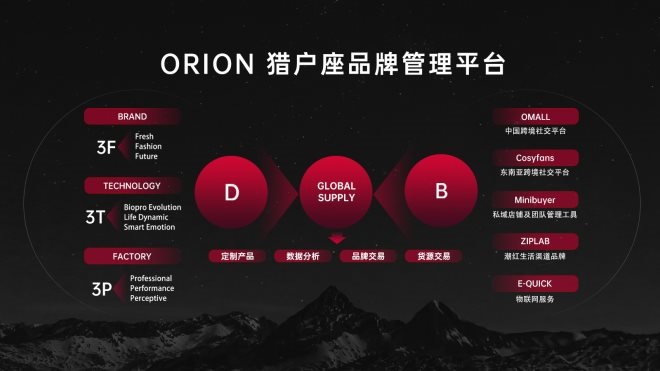 在供應端,以“品牌(Brand)、科技(Technology)、工廠(Factory)”為支撐,提供從品牌的輸出孵化,到具備技術壁壘的研發(fā),再到供應鏈快速反應的全體系搭建,為B端實現(xiàn)可見的增值轉化;在連接端,提供研發(fā)、產(chǎn)品、品牌、金融、渠道、營銷、數(shù)據(jù)的全域閉環(huán)體系,為B端提供整體品牌解決方案;在應用及渠道端,依托全球化跨境直賣電商平臺「O’Mall」、東南亞跨境直賣電商平臺「CosyFans」、私域店鋪及團隊管理工具「Minibuyer」、潮紅生活渠道品牌「ZIPLAB」、物聯(lián)網(wǎng)服務的「E-Quick」,五大渠道體系滿足全球更廣域的人群需求。