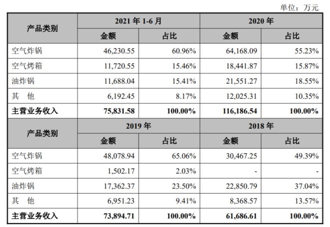 其中,比依股份的空氣炸鍋銷售收入由2018年的3.05億元增至2020年的6.42億元,年均復(fù)合增長率達45.13%;空氣烤箱銷售收入由2019年的1502.17萬元增至2020年的18441.87萬元。加上此前的主營產(chǎn)品油炸鍋,三項業(yè)務(wù)營收占據(jù)了比依股份90%以上的份額。