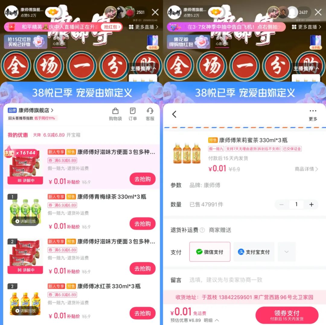 目前,康師傅、良品鋪?zhàn)、百事可樂、徐福記等品牌的快手官方直播間均有一分購活動(dòng)!感蚂亍褂^察發(fā)現(xiàn),僅有新用戶和30天之內(nèi)未在平臺(tái)下單的用戶,具有一分購資格。一分錢下單后,產(chǎn)品多會(huì)變成6.9元及以上價(jià)格。