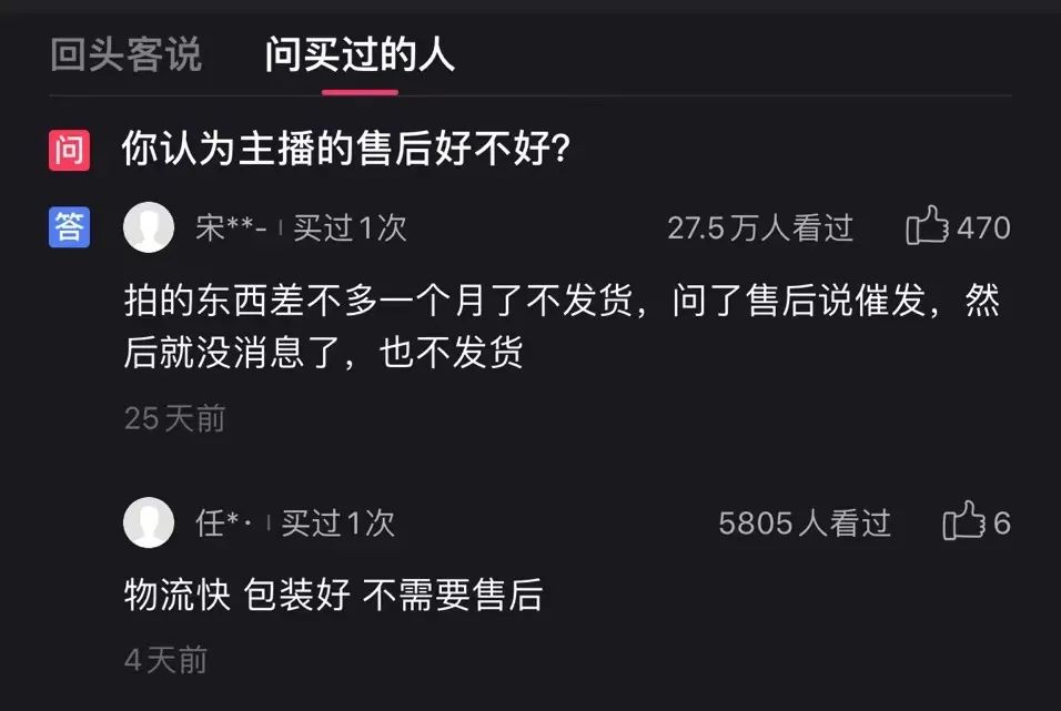 康師傅一分購直播間評(píng)分低的原因,在直播間問答區(qū)中可見一斑。在“你認(rèn)為主播的售后好不好?”問題下,閱讀量和點(diǎn)贊量最高的回答為“拍的東西差不多一個(gè)月了不發(fā)貨,問了售后說催發(fā),然后就沒消息了,也不發(fā)貨!