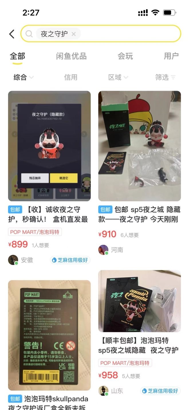 據(jù)悉,“SKULLPANDA夜之城系列”盲盒,該系列含有12個(gè)常規(guī)款及1個(gè)隱藏款,單個(gè)盲盒售價(jià)為69元,整套售價(jià)為828元。其中,涉事隱藏款盲盒“夜之守護(hù)”的抽取幾率為1/144。也就是說(shuō),消費(fèi)者要花9936元購(gòu)買(mǎi)144個(gè)盲盒,才有可能抽中這一隱藏款。這一隱藏款“夜之守護(hù)”在閑魚(yú)已高達(dá)900元。