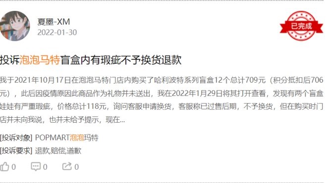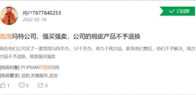 此次事件起源于有多位消費(fèi)者在泡泡瑪特官方渠道抽中了“SKULLPANDA夜之城系列”隱藏款盲盒“夜之守護(hù)”,因有瑕疵申請(qǐng)售后換貨,卻被泡泡瑪特客服以“與正品不符”為由,拒絕換貨,但未出示相關(guān)鑒定證據(jù)。還有消費(fèi)者在換貨過(guò)程中,泡泡瑪特寄回的商品和退回商品不一致。