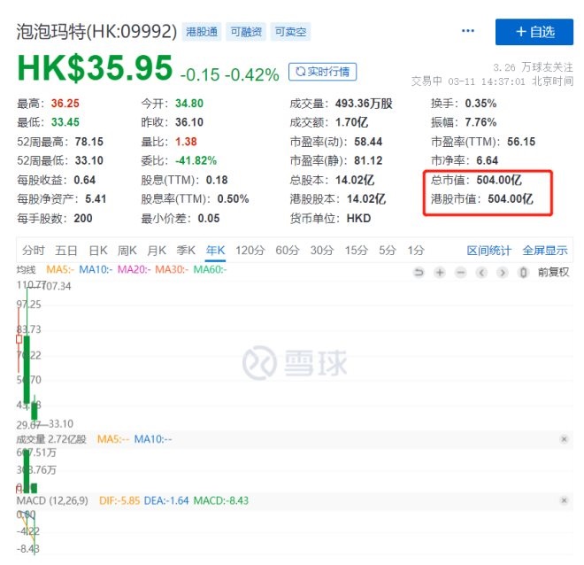 事實(shí)上,從泡泡瑪特創(chuàng)立之初,就被瑕疵、二次售賣(mài)、天價(jià)盲盒等負(fù)面消息纏繞。不過(guò),這并不影響泡泡瑪特在2020年12月在香港聯(lián)交所上市。當(dāng)天股價(jià)大漲100%,上市首日便榮獲市值超千億的“玩具茅”公司的名號(hào)?扇缃瘢菖莠斕夭粡(fù)當(dāng)日輝煌。截至2022年3月11日,泡泡瑪特的市值腰斬,僅為504億,35.95港元/股的股價(jià)已低于38.5港元/股的發(fā)行價(jià)。