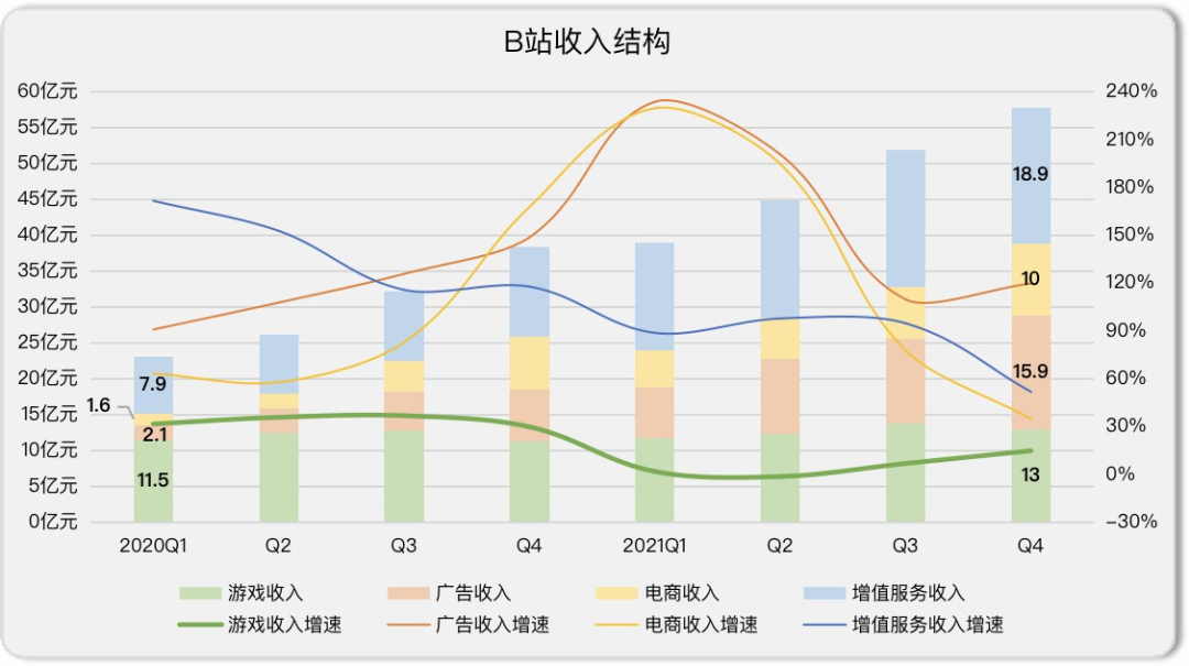 從B站的收入結(jié)構(gòu)可以看到,游戲收入,確切地說是來自游戲分發(fā)的收入,六個季度后被增值服務(wù)反超,增速上保持很強韌性。由于缺乏爆款,單純依靠年輕社區(qū)做游戲分發(fā)看上去不是一條穩(wěn)定的道路。