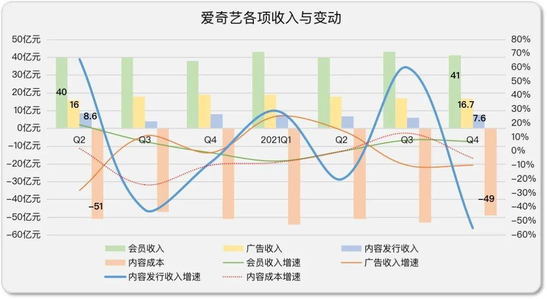 最近六個季度以來,愛奇藝的會員收入因為新增付費用戶增長不佳、迫于壓力取消超前點映,導致數(shù)據(jù)表現(xiàn)并不好看。與此同時,廣告收入長期低迷不振,內(nèi)容發(fā)行收入始終難堪大任。一旦占據(jù)大頭的會員收入增速低于內(nèi)容成本增速,那么愛奇藝根本不可能在業(yè)績上有任何改觀。