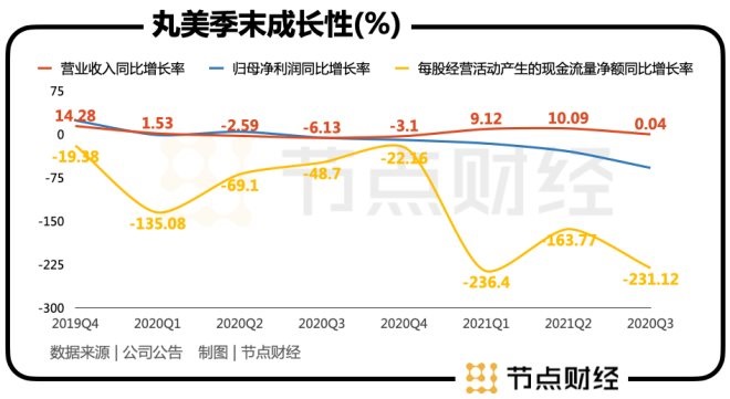如圖可見,丸美近8個季度季末的經(jīng)營活動現(xiàn)金流凈額持續(xù)惡化;營收增長率緩慢;凈利潤連續(xù)五個季度季末值下降。