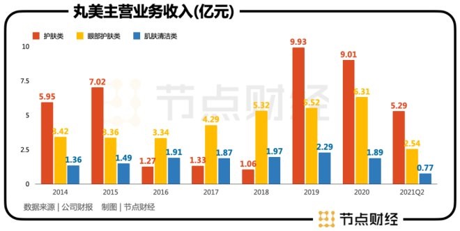 品牌方面,除定位中高端的“丸美”外,丸美也進行了差異化的品牌拓展,擁有大眾功能性護膚品“春紀”、輕奢韓系彩妝品牌定位“戀火”。但截至2021Q2,差異化定位效果尚不明顯,“丸美”營收占比高達95.48%,其他品牌收效甚微。