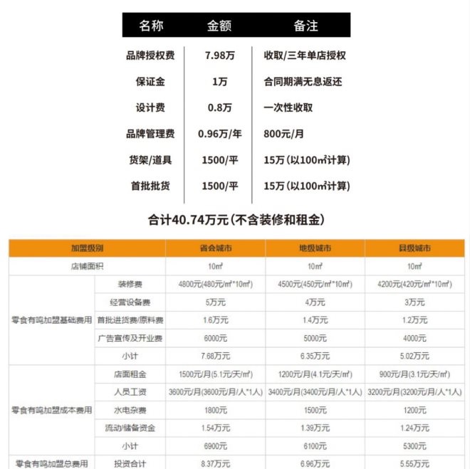 還有一類(lèi)品牌的加盟方式則需要在前期投入更多。據(jù)鋅刻度了解,“零食有鳴”一家10㎡的店鋪,需要投入包括加盟費(fèi)、保證金、裝修費(fèi)、經(jīng)營(yíng)設(shè)備費(fèi)、首批進(jìn)貨費(fèi)等在內(nèi)的費(fèi)用共計(jì)5.55萬(wàn)元至8.37萬(wàn)元之間;“好幸!币患100㎡左右的門(mén)店需要投入包括品牌授權(quán)費(fèi)、保證金、設(shè)計(jì)費(fèi)、品牌管理費(fèi)、貨架/道具費(fèi)、首批貨款在內(nèi)的費(fèi)用共計(jì)40.74萬(wàn)元。
