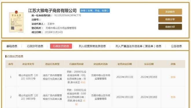 國家企業(yè)信用信息公示系統(tǒng)顯示,今年3月,雅迪全資持股的江蘇大猴電子商務有限公司因違反廣告內容管理規(guī)定行為及其從屬,被無錫市錫山區(qū)市場監(jiān)督管理局罰款兩次,共計3萬元。