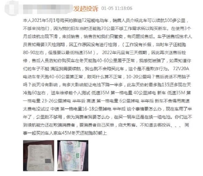 有消費者投訴稱,其在去年5月購買雅迪T2冠能電動車時,銷售人員介紹此車可以續(xù)航100多公里,然而消費者使用三個月后續(xù)航出現下滑(當時車子還能跑80—90公里左右,但是要以最低擋速)。今年1月車輛送檢,消費者被售后人員告知冬天能跑40—60公里屬于正常。消費者認為雅迪電動車店大欺客。