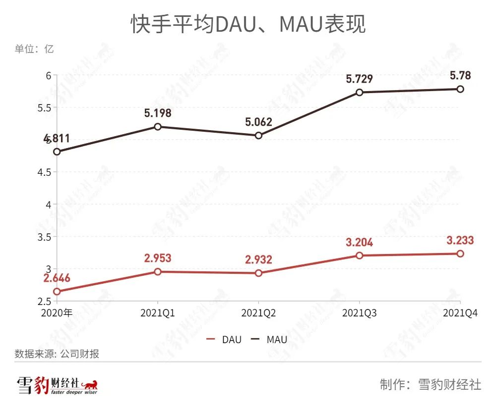 2021年四季度,快手的平均DAU(日活用戶量)、MAU(月活用戶量)分別為3.233億、5.78億。而三季度的平均DAU、MAU分別是3.204億、5.729億;四季度分別微增290萬與510萬。