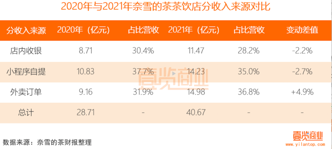 從收入來源看,2020年和2021年在店內收銀、小程序自提以及外賣訂單上面,占比營收變化不大。雖然有不少消息稱奈雪的茶茶飲店線上訂單占比71%,但這部分的線上訂單是由小程序自提和外賣訂單構成。
