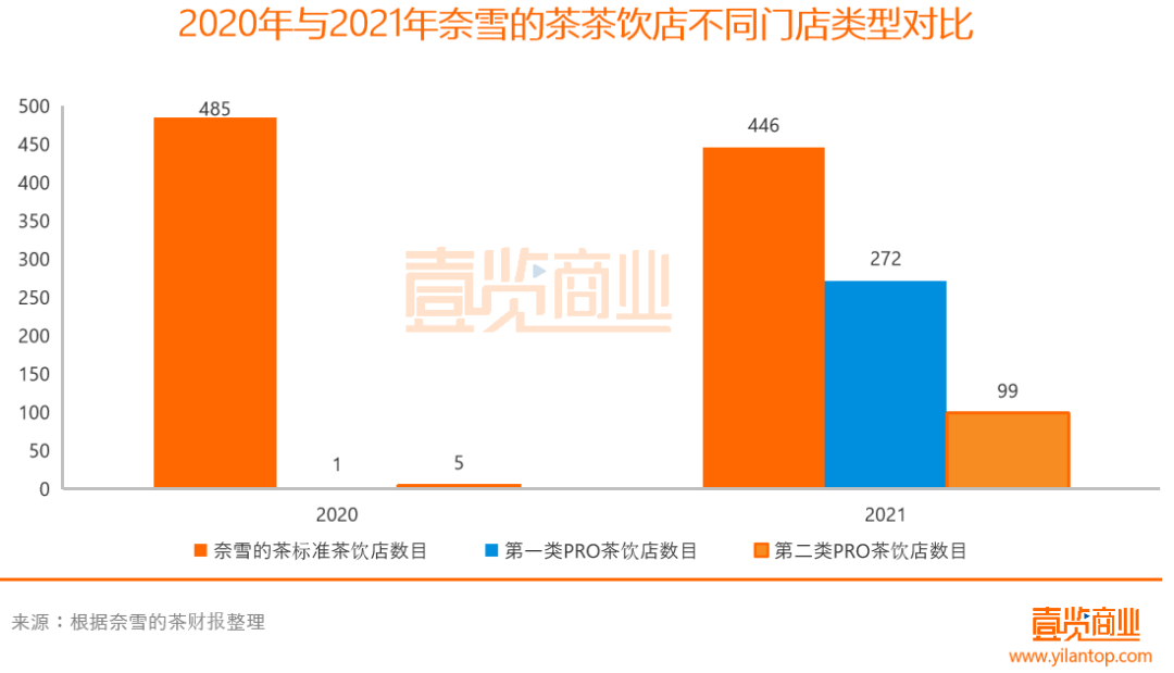 2021年,奈雪在擴大開店規(guī)模的同時,也在開始不同門店的探索。2021年,奈雪的茶標準茶飲店共446家,第一類PRO茶飲店為272家,第二類PRO茶飲店為99家。和2020年相比,奈雪的茶在第一類PRO茶飲店和第二類PRO茶飲店加大了開店規(guī)模。