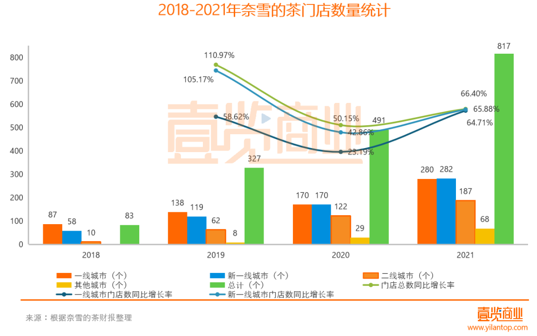 在門店擴張這方面,2021年奈雪的茶門店總數達到了817家,同比增長66.40%;一線城市共280家,同比增長64.71%;新一線城市282家,同比增長65.88%;二線城市187家,其他城市68家。