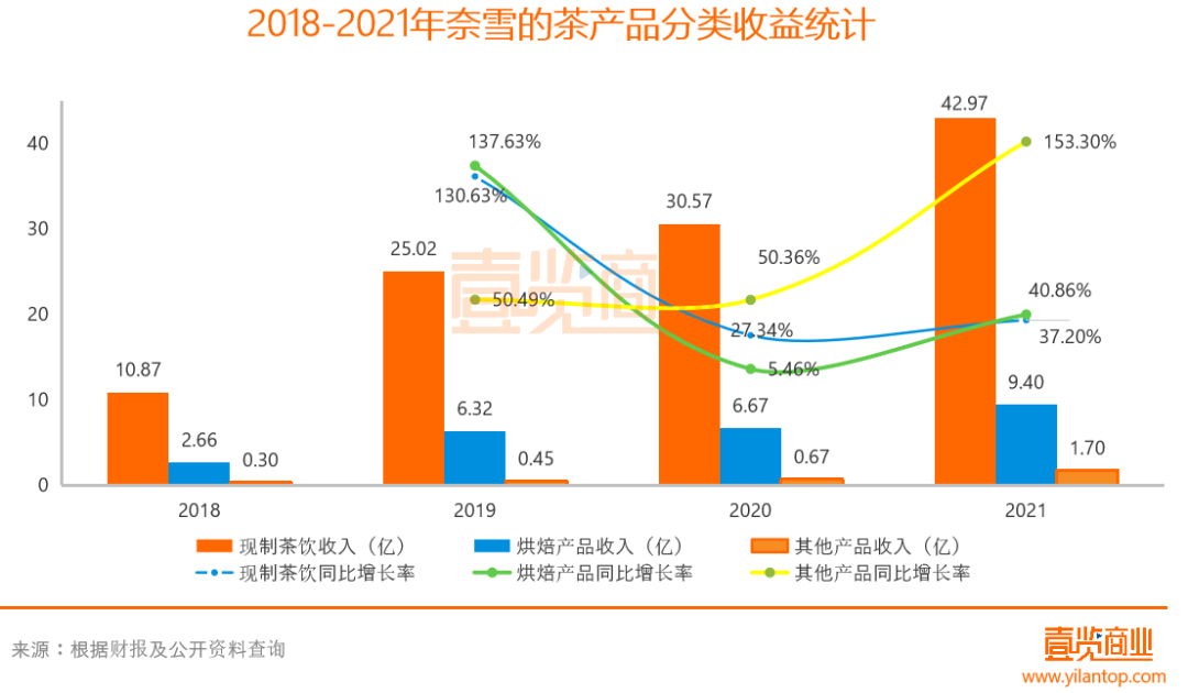 據奈雪招股書中表明,其他產品包括主要包括伴手禮及零售產品,如茶禮盒、零食及節(jié)日限定禮盒。在財報發(fā)布同天,奈雪還上線了初代潮玩NAYUKI。受疫情打擊,2020年的現制茶飲和烘焙產品的同比增長相比2019年,表現較差,而2021年受益于門店擴張將近一倍,現制茶飲和烘焙產品的同比增長相當,在40%左右徘徊。
