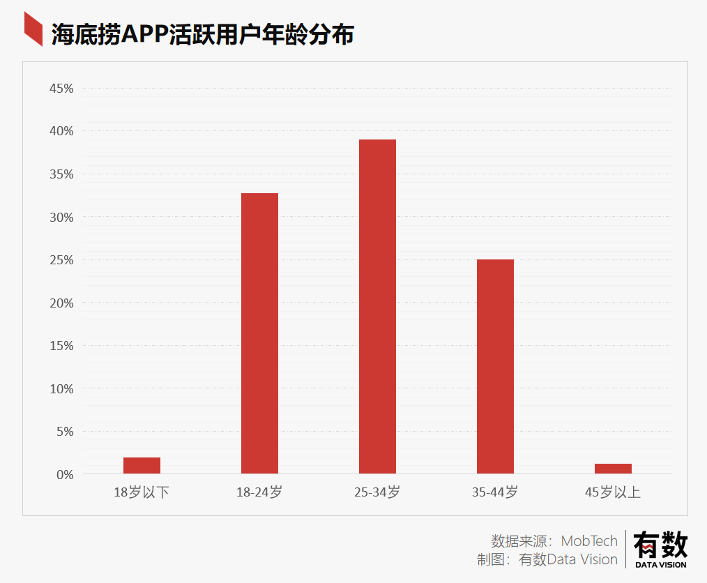 對(duì)消費(fèi)品來說,品牌老化是一個(gè)不可避免的問題,海底撈既沒有太二酸菜魚這種突出的單品,也沒有“此生必去一次”的網(wǎng)紅店氣質(zhì)。根據(jù)MobTech大數(shù)據(jù)顯示,從年齡分布來看,海底撈App的活躍用戶主要集中于25—44歲,其中35—44歲的人群喜愛度TGI指數(shù)達(dá)到144[3]。