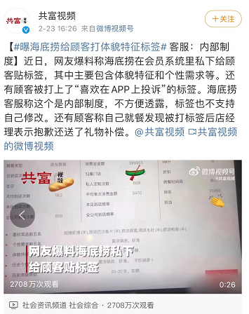 2月23日,海底撈因?yàn)榻o顧客貼標(biāo)簽而登上微博熱搜。消費(fèi)者對(duì)此反應(yīng)各異,一部分人認(rèn)為海底撈這樣做更有利于服務(wù)客戶,另一部分人認(rèn)為海底撈這樣差異化的措施讓自己感受到了冒犯。其實(shí)早在2019年,海底撈就推出了免打擾服務(wù)項(xiàng)目,對(duì)社恐非常友好。