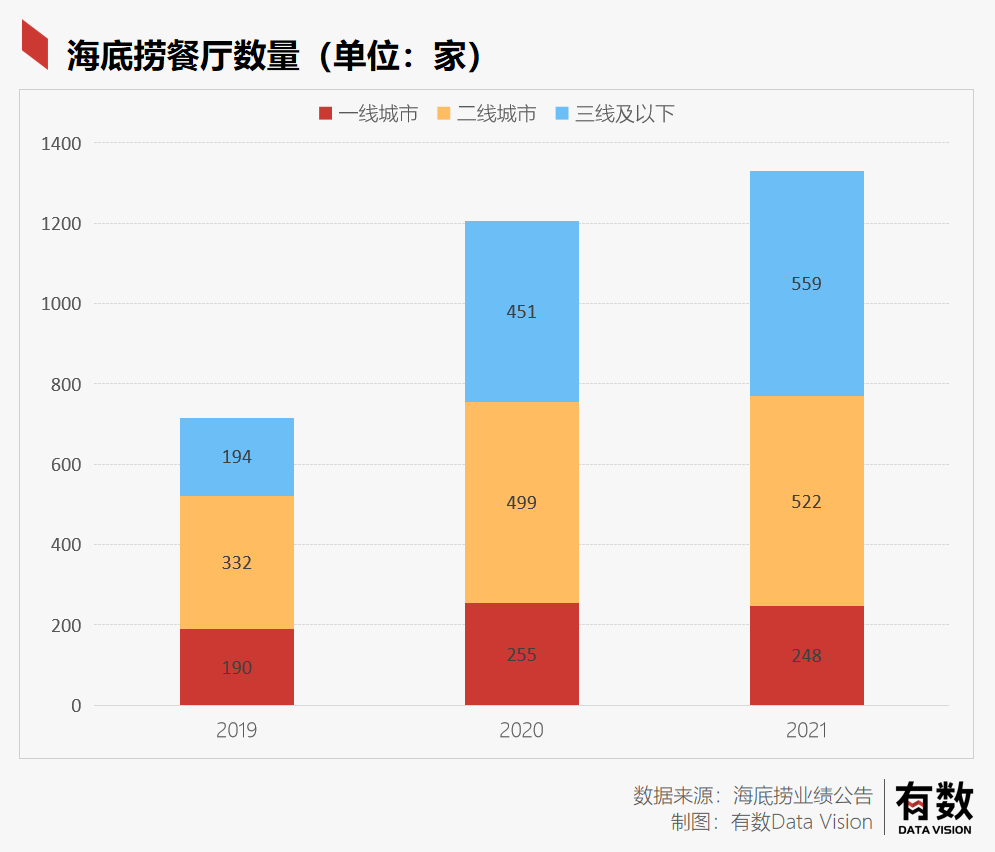 而且,中小城市中的品牌化連鎖餐飲企業(yè)更少,消費(fèi)能力也不如大城市,餐飲個(gè)體戶抗風(fēng)險(xiǎn)能力也較差,所以就有了大量的黃金地段空出,這也是海底撈“抄底”的重點(diǎn)區(qū)域。2021年,海底撈在三線及以下城市的店面數(shù)量,由2019年的194家暴增到2021年的559家。