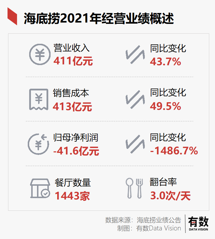 2021年財(cái)報(bào)顯示,海底撈集團(tuán)總收入為411.1億元,同比2020年增長43.7%,但是卻出現(xiàn)上市以來的首次虧損,而且虧損金額高達(dá)41.6億元。這是什么概念——海底撈一年虧掉了上市以來的所有盈利。