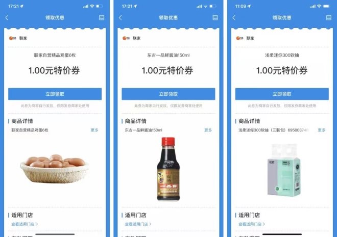在近期的幾場運營活動中,中皖知托付幫助聯(lián)家超柿借助支付寶平臺,在商家小程序中布局了“1元購”活動,通過發(fā)放爆品優(yōu)惠券,短短3天時間內(nèi),共核銷18243張,門店訪問次數(shù)達20萬次,核銷率達72%。