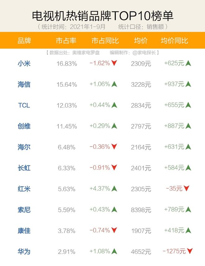 中怡康數(shù)據(jù)顯示,2021年上半年,海信電視在線下市場的銷量還是國內(nèi)第一。但結(jié)合奧維家電羅盤,線上線下綜合統(tǒng)計(jì)的數(shù)據(jù),2021年前三季度,小米電視市占率為16.83%,仍略微領(lǐng)先于海信的15.64%。