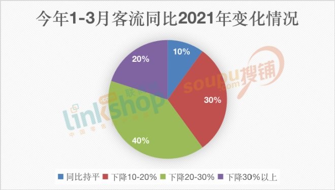 對于線下商業(yè)而言,客流是商場的生命線。而在此次參與問卷調(diào)查的商場中,僅有一成的商場表示今年1-3月客流同比2021年處于持平狀態(tài),剩余9成均表示有不同程度的客流下滑:30%商場認(rèn)為今年1-3月客流同比2021年下降了10-20%;40%表示下降了20-30%;20%家稱客流同比下降超30%。