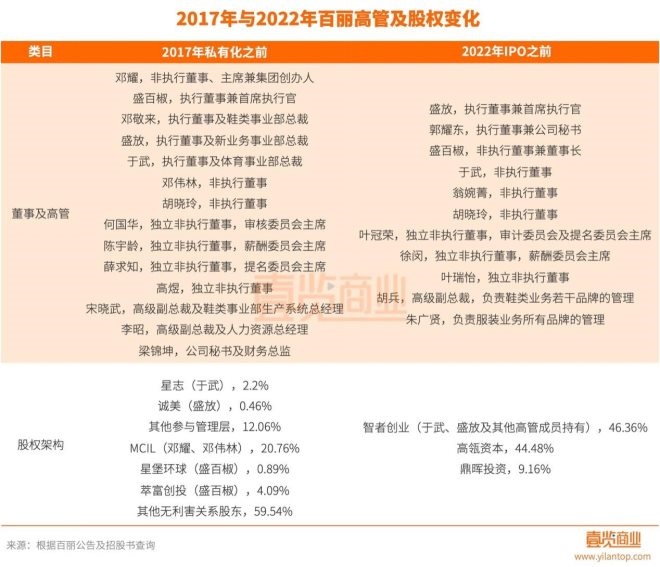 從董事及高管名單和股權架構變動中可以看出,私有化之后,百麗創(chuàng)始人鄧耀和其家族成員徹底套現(xiàn)退出,盛百椒則轉向幕后,CEO由其侄子盛放擔任。除了參與私有化的盛放、于武和鼎暉投資的胡曉玲,百麗的董事及高管名單可謂改頭換面。